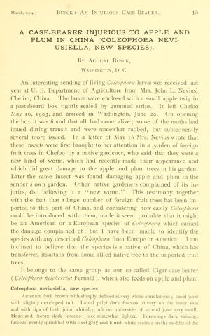 - Erstbeschreibung: Busck, A. (1904): A case-bearer injurious to apple and plum in China (Coleophora neviusiella, new species). — Journal of the New York Entomological Society 12 (1): 45-46.