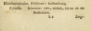 - Erstbeschreibung: Schrank, F. (1802): FAVNA BOICA. Durchgedachte Geschichte der in Baiern einheimischen und zahmen Thiere. Zweyter Band zweyte Abtheilung: 1-412. Ingolstadt (Johann Wilhelm Krüll).