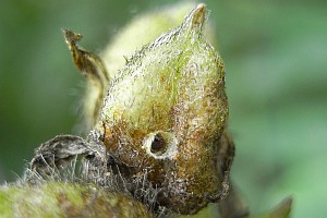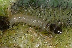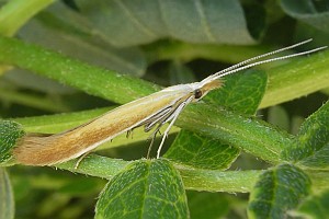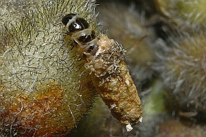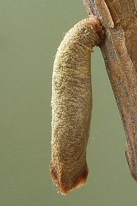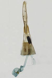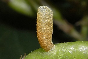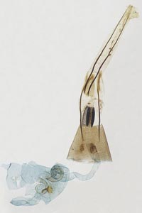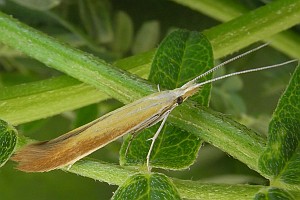 Schütze (1931) formulierte zur Raupe: "An Astragalus glycyphyllos in den Schoten, die reifenden Samen verzehrend, erst ziemlich erwachsen baut sie einen Röhrensack, der anfangs gelb, später braun, vorn nach unten etwas gebogen ist. Überwintert erwachsen (Sorhagen). Spinnt den Sack von der Mundöffnung anfangend. Man findet häufig unvollständige Säcke und kann dann ihr allmähliches Fertigwerden beobachten (Stange)."