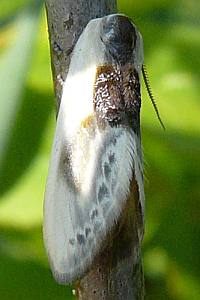 1: Puppenkokon, Daten wie Raupe 1 und Falter 2. Die Raupe hat sich am 24. Juni 2006 am Rand des befressenen Blattes verpuppt (Foto am 30. Juni 2006: Peter Buchner)