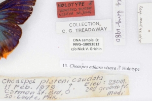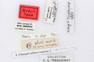 1-3: Holotypus ♂ von Choaspes adhara negrosa de Jong & Treadaway, 2007, Synonym von Choaspes adhara adhara, Daten siehe Etiketten (fot.: Nick V. Grishin, Fotos bearbeitet: Michel Kettner), coll. Senckenberg Museum für Tierkunde, Frankfurt.