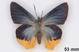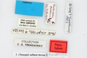 1-3: Paratypus ♀ von Choaspes adhara boreus de Jong & Treadaway, 2007, Synonym von Choaspes adhara adhara, Daten siehe Etiketten (fot.: Nick V. Grishin, Fotos bearbeitet: Michel Kettner), coll. Senckenberg Museum für Tierkunde, Frankfurt.