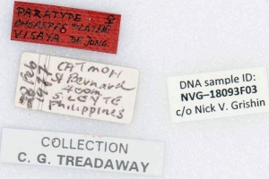 1-3: Paratypus ♀, Daten siehe Etiketten Daten siehe Etiketten (fot.: Nick V. Grishin, Fotos bearbeitet: Michel Kettner), coll. Senckenberg Museum für Tierkunde, Frankfurt.