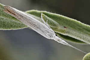 Staudinger (1859: 254) verriet in seiner Erstbeschreibung: "Raupe im Mai bei Granada auf Anthyllis cytisoides. Sack aus den Blättern der Pflanze, sehr breit und zusammengedrückt, nach hinten mit etwas gekrümmter Spitze." Dies scheint die einzige Nahrungspflanze dieser Art zu sein.