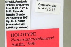 Austin (1996: 55): “Holotyp ♂ with the follwing labels: white, printed—BRASIL: Rondonia / 62 km S Ariquemes / linea C-20, 7 km E / B-65, Fazenda / Rancho Grande / 29 November 1991 / leg. G. T. Austin / (associated with / Labidus praedator); white, printed and hand-printed—Genitalic Vial / GTA—1611; red, printed—HOLOTYPE / Narcosius steinhauseri / Austin.” — Paratypen: 20 ♂♂, alle von demselben Fundort wie der Holotypus.