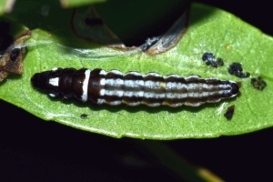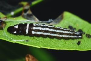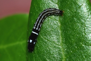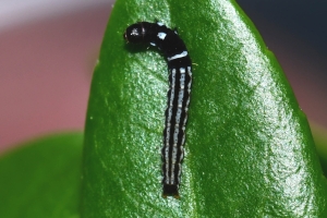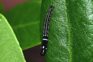 Die bei Corley & Ferreira (2019: 201) abgebildete auffällig schwarz-weiß gezeichnete und im Ganzen stark an eine Helcystogramma-Raupe (Gelechiidae) erinnernde "Designer-Raupe" scheint sehr langsam heranzuwachsen, zu überwintern und erst Ende Mai oder im Laufe des Juni ausgewachsen zu sein.