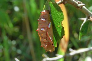1-2: ausgewachsene Raupe, ssp. aethiopica (Rothschild & Jordan, 1903): Frankreich, La Réunion, Ravine Divon beim Etang St. Paul, an Madagaskar-Pflaume (Flacourtia indica), 3. Dezember 2009 (leg., cult., det. & Fotos am 6. Dezember 2009: Georg Paulus)Forum