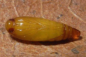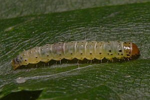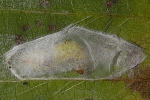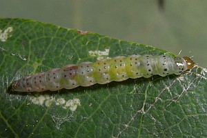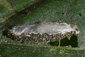 Schütze (1931: 75) trug zusammen: "Raupe August bis Oktober [...] An Quercus, Betula, wohl auch Acer zwischen zwei zusammen gesponnenen Blättern oder auf der Unterseite eines Blattes in einem mit Pflanzenresten versponnenem Gespinstgange. Verwandlung unter Rinde, im Moos, morschem Holz usw. nach der Überwinterung (Sorhagen). Der Falter kommt manchmal auch aus trockenen Eichengallen (Rössler)."