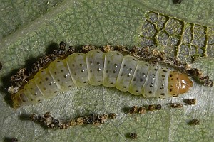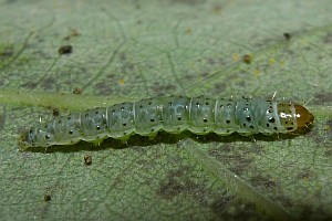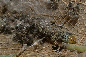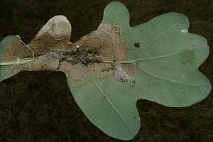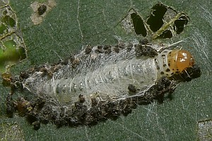Die oben gezeigten Raupen wurden von Heidrun Melzer an Quercus petraea, Quercus robur, Carpinus betulus und - überraschend - an Tilia cordata gefunden. Heidrun Melzer erläuterte dazu im [Forum]: "für die Zucht der Palpenmotte Teleiodes luculella (Teleiodini) habe ich zwei Anläufe gebraucht. Über die Biologie gibt es widersprüchliche Angaben (Raupen- oder Puppenüberwinterung). Nach meinen Erkenntnissen überwintert die erwachsene Raupe und verpuppt sich im Frühling in ihrem Überwinterungsgespinst, ohne nochmals zu fressen oder auch nur das Gespinst zu verlassen. Die Puppenruhe dauert nur kurze Zeit." Und weiter [im Forum]: "Im Spätsommer und Herbst kann man an verschiedenen Laubbäumen die Raupen von Teleiodes luculella finden. Meist an Eichen (Quercus robur, Q. petraea), aber auch an Hainbuche und Linde habe ich sie schon angetroffen. Normalerweise sind zwei Blätter flach zusammengesponnen, und dazwischen befindet sich die Raupenwohnung - ein seitlich mit Kotkrümeln (nicht mit Pflanzenresten, wie Schütze schreibt) belegter kurzer Gespinstschlauch, der nicht wesentlich länger als die Raupe selbst ist, aber in der Breite genügend Platz zum Wenden bietet. Hier ein Beispiel an Winterlinde (Tilia cordata)".