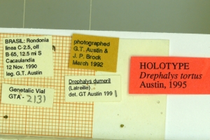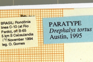 Austin (1995: 125): “Holotype ♂ with the following labels: [white, printed] BRASIL: Rondonia / linea C-2.5 off / B-65, 12.5 mi [sic = km] S / Cacaulandia / 12 Nov 90 / leg. G.T. Austin; [white, printed and handprinted] Genitalia Vial / GTA - 2131; [red, printed] - HOLOTYPE / Drephalys tortus / Austin. Deposited at the Departamento de Zoologia, Universidade Federal do Parana, Curitiba, Brazil.” — Paratypen: 8 ♂♂ und 7 ♀♀, alle aus Brasilien.