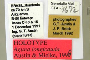 - Erstbeschreibung: Austin, G. T. & O. H. H. Mielke (1998): Hesperiidae of Rondônia, Brazil: Aguna Williams (Pyrginae), with a partial revision and descriptions of new species from Panama, Ecuador, and Brazil. — Revista brasileira de Zoologia 14 (4): 889-965. [PDF auf scielo.br]