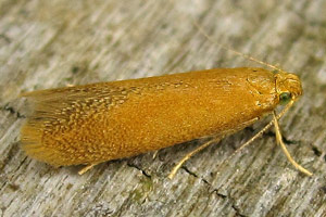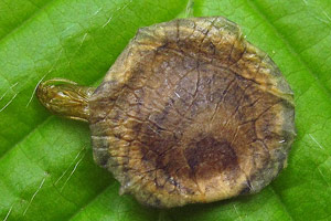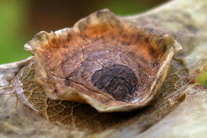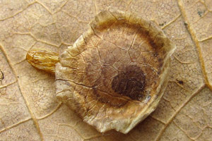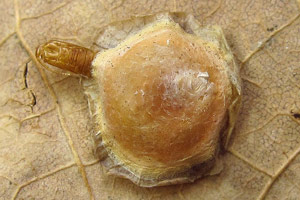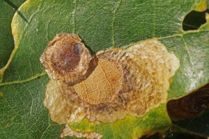 Ich finde die Minen im Oktober, November an Eichenbüschen oder tief hängenden Eichenästen. Günstig ist natürlich, wenn die Minen noch intakt sind. Dann schneide ich besetzte Blätter mit etwa 20-30 cm langen Zweigstücken und stelle diese ins Wasser. Nach einigen Tagen liegen dann darunter die kreisförmig ausgeschnittenen, flachen Überwinterungsminen (oder wie man die Gebilde dann nennen mag, Kokons oder Gespinste sind es ja eigentlich auch nicht). Man braucht unter den Zweigen kein spezielles Substrat und die Zweige im Wasserglas müssen in keinem weiteren Gefäß stehen, da die Gebilde nur herunter fallen und nicht seitwärts bewegt werden. Sie bestehen aus der oberen Epidermis des Eichenblattes und unten aus einem sehr feinen, fast pergamentartig wirkenden Gespinst. Dieses ist in der Mitte gewölbt und deutlich dunkler als der Rand. Ist man im Jahr zu spät unterwegs, so sind die fehlenden Teile in den Minen der Blätter mit einiger Übung leicht sichtbar. Dann suche ich unter den Büschen im Laub direkt am Boden. Auch da kann man die Gebilde relativ gut sehen, vor allem, wenn die ursprüngliche Unterseite nach oben liegt. Die Überwinterung erfolgt in Plasteschachteln mit Gazedeckel. Unten befindet eine etwa 5 cm dicke Schicht aus Torf und Torfmoos, darüber die Gebilde und darauf ein paar trockene Eichenblätter. Meist zerschneide ich die Blätter mehrfach, da sie sich dann besser schichten lassen. Das Ganze kommt unter die im Herbst im Garten umgestülpten Regentonnen und wird erst im Frühjahr (in diesem Jahr am 02. April) direkt ins Zimmer geholt und dann regelmäßig besprüht. Nach etwa 3 Wochen sitzen dann die Falter im Gefäß.