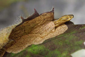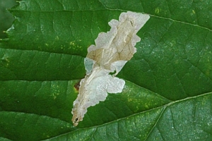 2: Exuvie an Blattoberseite, Österreich, Niederösterreich, 2 km W Seebenstein, Heidelbeer-Rotföhrenwald, Lichtung, 440 m, leg. 31. Oktober 2005 Mine auf Rubus spec., e.l. 18. Februar 2006 (Foto: Peter Buchner), cult. & det. Peter Buchner