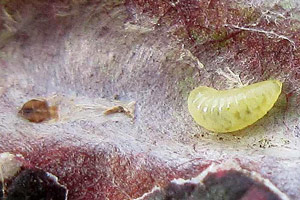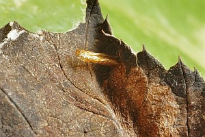 1-2: parasitoide Wespenlarve (ca. 2-3 mm) nebst ausgefressenem Raupenbalg, in geöffneter Mine von Coptotriche marginea: Deutschland, Nordrhein-Westfalen, Hürth, Seeufer, 89 m, 6. Februar 2021 (det. & fot.: Jörg Siemers)Forum