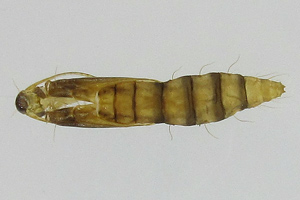 4-6: Exuvie, 5.5 mm (5 = ventral, 6 = dorsal): Deutschland, Niedersachsen, Rodenberg, 133 m, nordexponierter Waldrand eines an Fichten reichen Waldstücks oberhalb der Windmühle, leg. Mine von Rubus spec. 4. März 2017 (in Zimmerwärme), Falterschlupf 23. März 2017 (cult., det. & fot.: Tina Schulz)