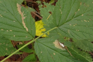 8: Mine an Himbeere (Rubus idaeus): Deutschland, Niedersachsen, Solling, Landkreis Holzminden, Umgebung Boffzen, Nähe Parkplatz Rottmünde, Mischwald, 333 m, 3. November 2020 (det. durch Zucht zum Falter, cult. & Freilandfoto: Tina Schulz)