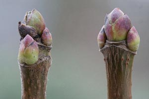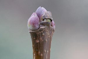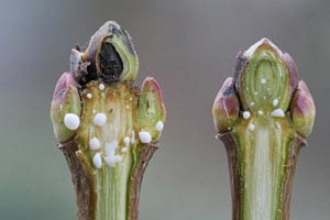 3-4: Mine im Winter in Endknospe von Spitzahorn (Acer platanoides), eine abgestorbene, dunkle Schuppe verrät die Anwesenheit der Raupe (die Knospe links ist besetzt, die rechte Knospe nicht): Deutschland, Nordrhein-Westfalen, Bielefeld-Senne, 120 m, nach Norden ausgerichteter Waldsaum, Jungaufwuchs von 1 - 3 m Höhe, 18. Februar 2019 (leg., det. & fot.: Dieter Robrecht)Forum