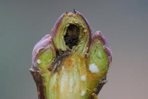 5-6: Mine im Winter in Endknospe von Spitzahorn (Acer platanoides), eine abgestorbene, dunkle Schuppe verrät die Anwesenheit der Raupe (in der geöffneten Knospe ist die Raupe im rechten Fraßbereich): Deutschland, Nordrhein-Westfalen, Bielefeld-Senne, 120 m, nach Norden ausgerichteter Waldsaum, Jungaufwuchs von 1 - 3 m Höhe, 18. Februar 2019 (leg., det. & fot.: Dieter Robrecht)Forum