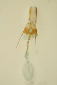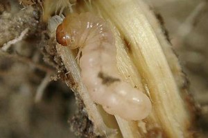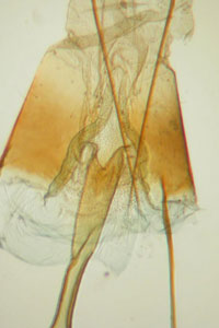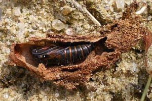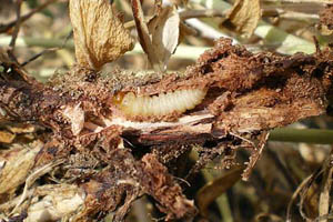 Bereits bei leichtem Zug reißt die Pflanze wenig unterhalb der Erdoberfläche ab. Man sieht (Bild 2) die mit Kot und Fraßmehl zugestopften Gänge; die Raupe oder Puppe hat sich bereits eine Kammer mit Gespinstkappe angelegt. Am besten ist es, den Pflanzenteil so wie er ist in einen Kasten mit Sand o.ä. Substrat zu geben und nur mäßig zu befeuchten.