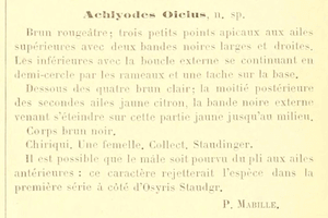 - Erstbeschreibung: Mabille, P. (1889): Diagnoses de lépidoptères nouveaux. — Le Naturaliste, 2e Série 3 (45): 25. — Digitalisat auf biodiversitylibrary.org: [25]