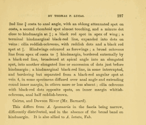 - Original description: Lucas, T. P. (1891): On Queensland and other Australian Lepidoptera, with descriptions of new species. — The Proceedings of the Linnean Society of New South Wales. Second series 6 (2): 277-306. Sydney (F. Cunninghame & Co.).
