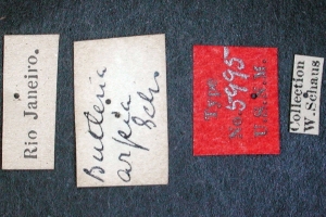 7-9: Syntypus ♂ von Butleria arpia Schaus, 1902: Daten siehe Etiketten (fot.: Bernard Hermier, Fotos bearbeitet: Michel Kettner), coll. National Museum of Natural History, Washington, D.C., USA.