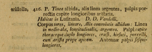 - Lectotypus-Festlegung: Robinson, G. S. & E. Schmidt Nielsen (1983): The Microlepidoptera described by Linnaeus and Clerck. — Systematic Entomology 8: 191-242.