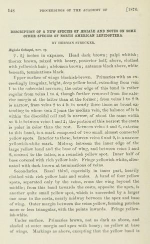 - Erstbeschreibung: Strecker, H. (1876): Description of a new species of Aegiale and notes on some other species of North American Lepidoptera. — Proceedings of the Academy of Natural Sciences of Philadelphia 28: 148-153. — Digitalisat auf biodiversitylibrary.org: [148]