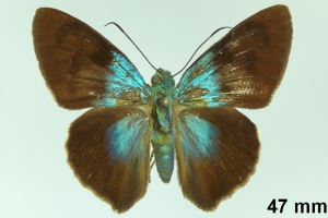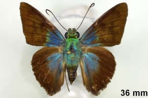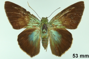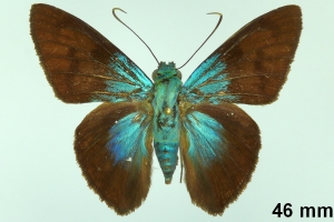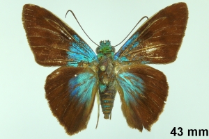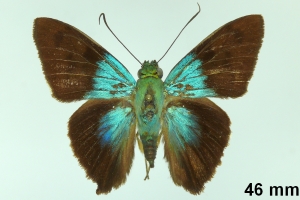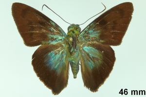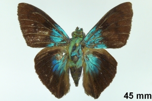 “Papilio creteus has green wing bases and body, pale-yellow palpi beneath, and a paler ventral side of the wing with broader pale-brown bands and lacks a prominently paler streak near the hindwing tornus (Fig. 67a). Papilio parmenides has bluish green (greener on forewings) wing bases and body, pale bluish palpi beneath, a darker ventral side of wings with narrower paler bands, and a more prominent pale streak (posterior part of the outer paler band) by the hindwing tornus (Fig. 67a). Due to rounder hindwing tornus, this illustrated specimen (or specimens, it is possible that the dorsal and ventral drawings show different specimens) might have been a female (or females), but not necessarily, because the positioning of wings and possible wing damage (e.g., as in Fig. 67c) might have caused an artifact in the illustration drawn from a male.” (Zang et al., 2025).