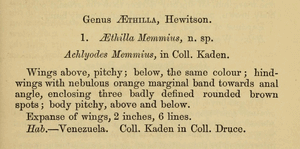 - Erstbeschreibung: Butler, A. G. (1870): Descriptions of some new Diurnal Lepidoptera, chiefly Hesperiidae. — The Transactions of the Entomological Society of London for the Year 1870 (4): 485-520. [Digitalisat auf biodiversitylibrary.org]