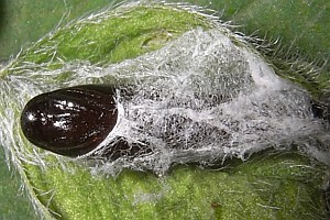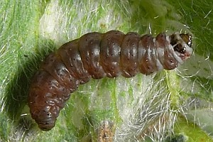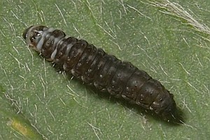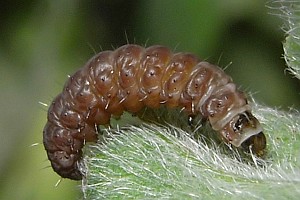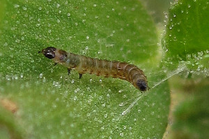 von Heyden (1861: 36-37) berichtete: "Raupe kurz, breit, etwas niedergedrückt, die Segmente stark eingeschnürt, fettglänzend, rothbraun, mit einzelnen kurzen, helleren Borsten. Kopf klein, herzförmig, glänzend, schwarzbraun. Nackenschild mit breitem, schwarzbraunem, glänzendem Fleck. Puppe kolbig, nach hinten verschmälert, glatt, glänzend, schwarz; die Scheiden anliegend, gleichlang, die drei letzten Segmente frei lassend, grünlichschwarz. Ich fand die Raupe zuerst Mitte October auf den Anhöhen hinter Offenbach in den Blättern von Anthyllis vulneraria minirend. Die Mine bildet einen grünlichweissen, mehrlappigen, gewöhnlich von der Gegend des Blattstieles auslaufenden Fleck auf der Oberseite der Blätter. Wird die Raupe älter, so zieht sie das Blatt in der Gegend des Stieles nach oben schotenförmig zusammen; bei kleineren Blättern bis zur Spitze, die dann blasenartig aufgetrieben erscheinen. Ein Theil der Raupe verlässt vor Winter die Minen, während andere in den immergrünen Blättern überwintern. Ausserhalb der Blätter verfertigt sich die Raupe ein enges, längliches, dünnes, hellgraues Gespinnst, in dem sie im April zur Puppe wird. Die Motte entwickelt sich Mitte Mai. Ohne Zweifel findet eine zweite Generation statt. Auch bei Jugenheim am Odenwalde habe ich die Raupe häufig gefunden. (1855.)"