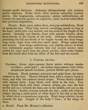 Walker (1854: 488-489) beschrieb seine neue Gattung und neue Art nach einem Exemplar "from Mr. Mornay's collection" aus Brasilien. [boldsystems.org] zeigt auch einen Falter aus Honduras und etliche Tiere aus Costa-Rica - dabei könnte es sich aber jeweils um Cissura plumbea Hampson, 1901 handeln.