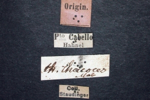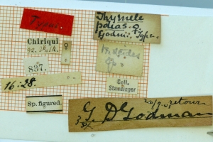 1-3: Syntypus ♀ von Thymele polias Godman, [1901], Daten siehe Etiketten (fot.: Ernst Brockmann, Fotos bearbeitet: Michel Kettner), coll. Zoologisches Museum der Humboldt-Universität zu Berlin.