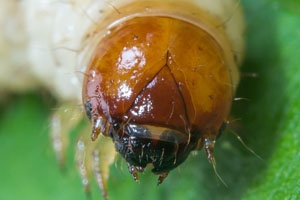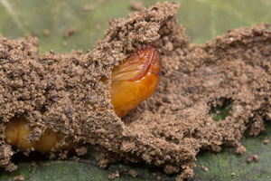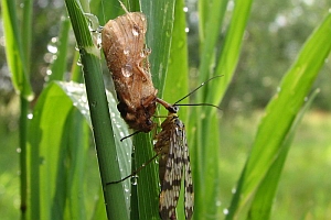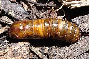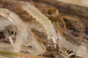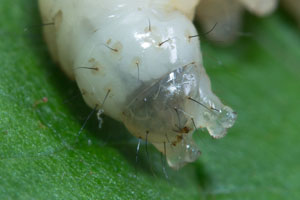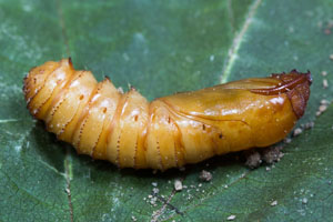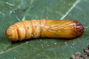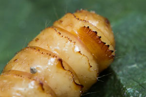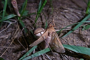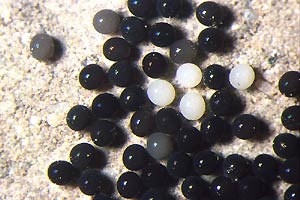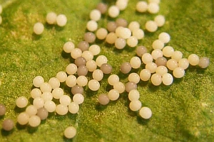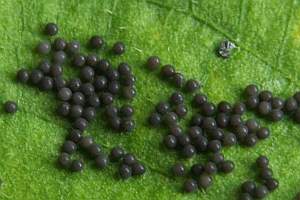 Wie alle Hepialiden-Weibchen streut auch Triodia sylvina die Eier wahllos in der Vegetation aus. Dies soll angeblich auch im Flug geschehen. Ich habe dies nicht beobachten können, wohl aber, dass die Weibchen mit flatternden Flügeln in der Krautschicht sitzen und die Eier einfach zu Boden kullern lassen. Im Bild 1 sind verschieden alte Eier zu sehen, die weissen sind soeben abgelegt worden, die schwarzen sind bereits eine knappe Stunde alt [Rudolf Bryner].