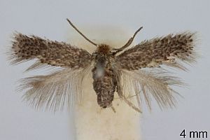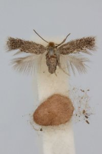 „260 (257) Fejszőrözete barna. Elülső szárnyának alapszíne szalmasárga, a sötét pikkelybehintés a hímen ritkább, a nőstényen sűrűbb. Csápja barna, valamivel hosszabb, mint az elüső szárny felső szegélyének a fele (hím), vagy éppen olyan hosszú (nőstény). Szemtakarója ará nylag nagy, fehér, tarkóbojtja ugyanilyen színű. 3–4 mm.