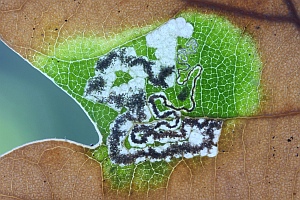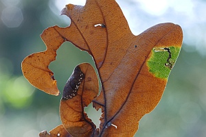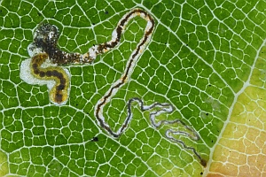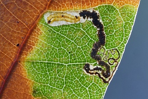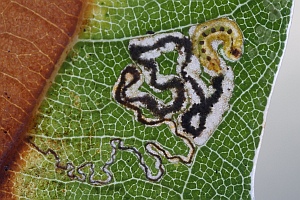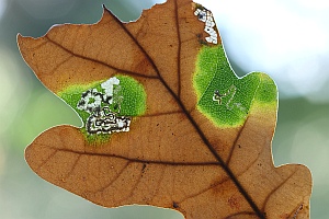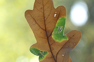 Van As & Scheffers (2013) melden aus Holland Raupenfunde in Minen an Stiel- und Trauben-Eiche. Auf [bladmineerders.nl] wird auch eine Blattmine an Quercus pubescens (Flaum-Eiche) in Essex (Großbritannien) gezeigt. Der Erstfund in Deutschland derfolgte an Stiel-Eiche. Die Minen mit Larven sind im Oktober und (Anfang) November in grünen Inseln in ansonsten schon herbstlich verfärbten Blättern zu finden. Und wie Jörg Siemers gezeigt hat, kann man solche Blätter selbst noch Mitte Dezember im Falllaub erkennen.