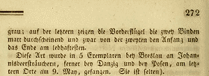 Die Lepidopterologische Fauna von Lievland und Curland von Lienig & Zeller wird in der Literatur uneinheitlich auf das Publikationsjahr 1846 oder 1847 datiert. Beim Versuch, Evidenz für das eine oder das andere Jahr zu finden, fand ich nichts für das in Frage stehende Doppelheft 3-4 des Jahrgangs 1846 der „Isis von Oken“, wohl aber für andere Isis-Hefte: Der Entomologische Verein zu Stettin dokumentierte seine Bibliotheks-Neuzugänge in den meisten Protokollen seiner Vereinssitzungen. Im Protokoll der Sitzung vom 9. Oktober 1846 ist der Eingang von Heft 7 der Isis 1846 vermerkt [Seite auf biodiversitylibrary.org], entsprechend am 6. November 1846 Heft 8 der Isis 1846 [Seite auf biodiversitylibrary.org]. Soweit spricht anscheinend nichts dagegen, dass auch das Doppelheft 3-4 pünktlich erschien. Gleichwohl habe ich die Entomologische Zeitung Stettin nach verspäteten Bibliothekseingängen von Isis-Heften durchsucht, und zwar in allen Protokollen der Jahrgänge 7-9 (1846-1848). Im einzelnen ergab sich dies: