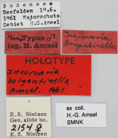 - Incurvaria brigantinella Amsel, 1961 [formelle Synonymisierung steht noch aus; siehe unter „Taxonomie“]