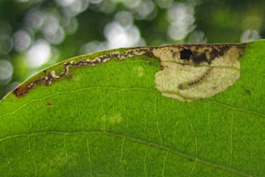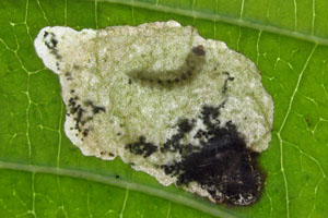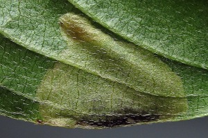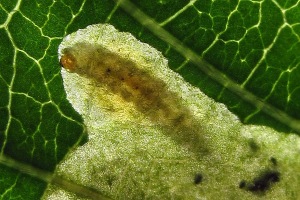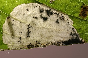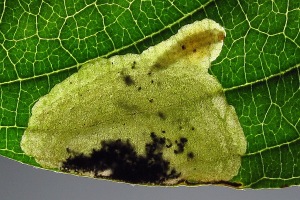 Unten: Antispila petryi: Schweiz, Fribourg, Mont Vully, 500 m, Raupe an Cornus sanguinea, 8. Oktober 2015 (leg., det. & Foto: Rudolf Bryner) [Forum]