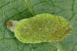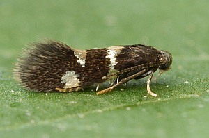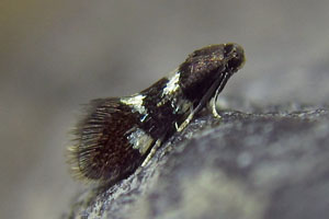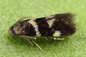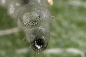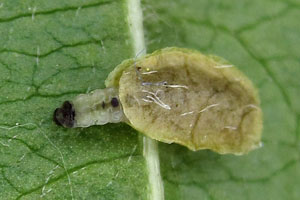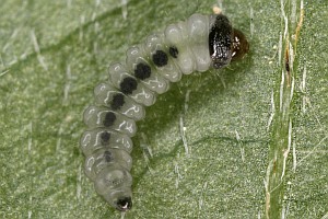 Antispila metallella: Raupe hinter dem hellen Dorsalfleck am 8. Segment nur eine Querreihe großer dunkler Punkte, dazwischen einige viel kleinere dunkle Punkte.