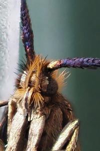 - Fühlerbasis durch blau bis violett glänzende Schuppen verdickt.