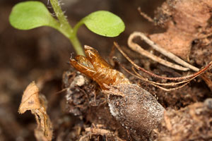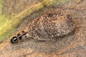 Mit birnenförmigen, sehr flachen Erdsäcken gehen die Raupen schliesslich in Winterruhe, indem sie sich unter der Bodenstreue ein wenig in die oberste Erdschicht eingraben. Im Frühling sind die Raupen nochmals aktiv und fressen fleissig die spriessenden Blätter der Nahrungspflanze. Dabei werden die Gehäuse auf eine Länge von 9-11 mm vergrössert.
