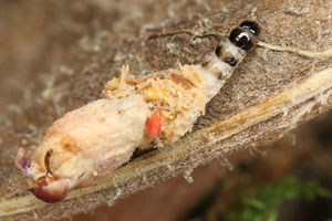 - N. cupriacella (rechts: Raupensack aus Succisa): birnenförmiger Erdsack von körniger Struktur, in der Mitte deutlicher eingeschnürt.