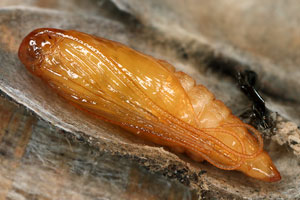 Verpuppung: Höchstens das breitere Ende des Gehäuses guckt aus der Bodenstreu oder der Erdschicht hervor, meistens ist der Raupensack mit der Puppe völlig verborgen. Vor dem Schlüpfen arbeitet sich die Puppe zu zwei Dritteln aus dem Gehäuse heraus. Der Schlupf der Falter erfolgt morgens früh bei Sonnenaufgang bis spätestens 2 Stunden danach.