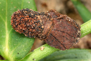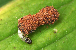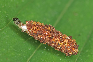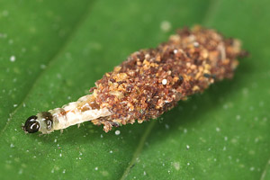 Im September sind die Raupensäcke durch einseitigen Anbau von Blattstücken nochmals vergrössert worden und haben eine Länge von 7-8 mm erreicht. In dieser Phase gehen die Raupen in die Winterruhe über.