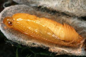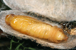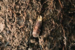 Offensichtlich nahmen die Raupen nach der Überwinterung keine Nahrung mehr zu sich und verharrten in ihren Säcken bis zur Verpuppung mehrheitlich unter der Erdoberfläche. Während einige Falter aus Gehäusen schlüpften, welche nur etwa 1 cm unter der Bodenoberfläche lagen, fanden sich Raupensäcke mit Exuvien bis zu 7 cm unter der Erdoberfläche. Die Falter waren also nach dem Schlüpfen gezwungen, durch Erdritzen an die Oberfläche zu gelangen. Alle Falter schlüpften jeweils am frühen Morgen bei Sonnenaufgang bis spätestens 2 Stunden danach.