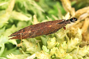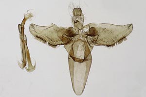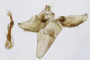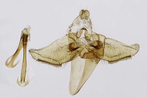 3: ♂, Schweiz, Bern, Saicourt, Hochmoor, 920 m, 9. Oktober 2013, Raupe aus Bodenstreu gesiebt, in Zimmertemperatur am 14. März 2014, e.l. 6. April 2014 (leg., cult., det. & Foto: Rudolf Bryner) [Forum 2-3]