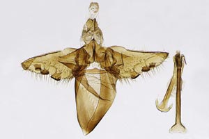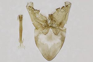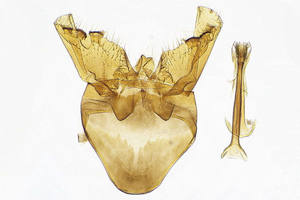 4, aus sechs Blattausschnitten konstruierter Sack: Funddaten wie Bild 1, ♂ e.l. 4. April 2012 (leg., cult., det. und Foto: Rudolf Bryner)