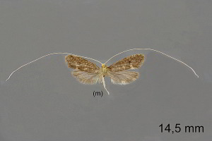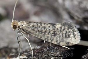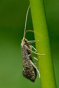 Kleinere Art; Spannweite 13-17 mm; Fühler weiss. Vorderflügel dunkel, graubraun mit deutlicher Gitterzeichnung; dunkler Zellendfleck (Diskalfleck) und helle Flecke am Flügelhinterrand (Dorsal- und Tornalfleck) meistens deutlich ausgebildet. Im Gegensatz zur ebenfalls dunkel gefärbten N. magna deutlich kleinere Art. Vorzugsweise in Nadelwäldern. Flugzeit ab Mai. (Rudolf Bryner)