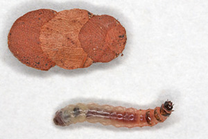 Die Raupen zeichnen sich durch eine rötliche Färbung der vorderen Körpersegmente aus. Sie nutzen wahlweise das hintere und vordere Sackende als Kopfteil und wechseln auch sehr rasch vom einen zum anderen. Es wurden auch Raupengehäuse gefunden, welche aus fünf oder sogar sechs Blattausschnitten konstruiert sind.